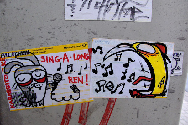 Then I started to mass produce stickers. I put various small motifs on A4 sized printable label sheets, printed them out on my inkjet printer at home and cut them by hand (that was before the postal label agency disaster…). But it was difficult to get the backs of the stickers off. I wanted to get the backs off fast and get the stickers up quick because I was paranoid about getting caught.