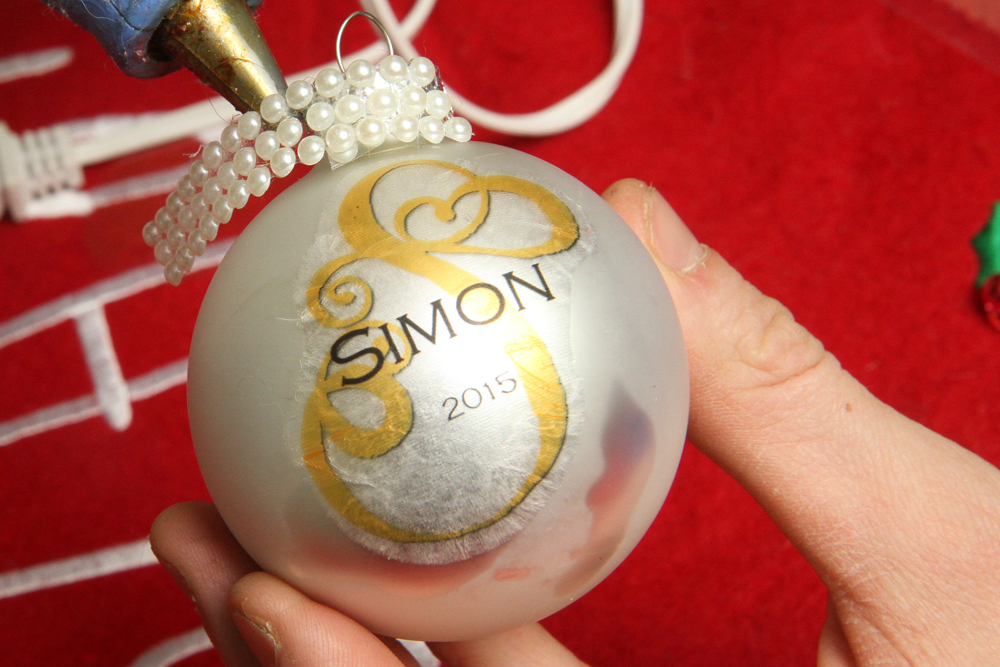 Step 3. Apply the temporary tattoo to the surface of the ornament. You do this buy peeling up the clear coating of the temporary tattoo. Then apply the tattoo ink-side down onto the bulb. Hold the temporary tattoo in place and then dampen with your sponge until the paper backing of your temporary tattoo is all wet.