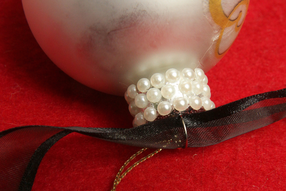 Step 7. Once the temporary tattoos have dried, you can wrap bead or pearl strings around the top of the ornament near the hanging loop. This adds extra style to the ornament. Carefully measure out how much of the bead or pearl string you will need and cut to size. Adhere into place with a hot glue gun or strong craft glue. Set aside to dry.