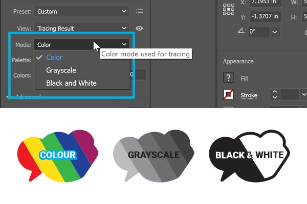 In the Image Trace panel click the “Mode” drop down menu to select a suitable option. For each option, the slider that appears below will show either: “Color”,”Grays”, or “Threshold” and adjusting the cursor’s position will affect your vector image.While each option changes a different aspect of the image the overall effect is the same: lower on the scale makes your image more simple, and higher makes it more intricate.
