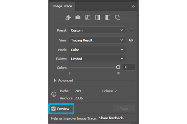 If adjusting the mode slider isn’t enough you can perfect your trace by selecting the "Advanced" extension on the Image Trace panel. This will open up the sliders for "Paths", "Corners", and "Noise". These sliders, much like the mode slider, can affect each image differently - so it’s good to experiment with different settings to achieve the best result.