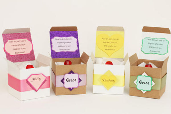 How you do it:Ā Buy boxes at your local craft store or dollar store. They need to be big enough to hold a few items. They can be made of wood, cardboard, tin or any other material. Fill with colored tissue paper and small items your bridesmaids will love. This could include a small bottle of wine or champagne, colored tic-tacs or other candy, personalized jewelry, a small candle, nail polish, a small framed photo of the two of you, or any assortment of small items. Bonus points if the colors match. Fill the box with these items. Create a custom sticker with a few words about why your bridesmaid is important to you or a custom photo sticker of the two of you. Add the words "be my bridesmaid?" at the bottom. Adhere this sticker to the inside lid of the box, then shut and wrap however you choose. This makes a great surprise gift and can be used as a keepsake box for days to come.