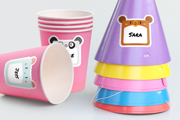 You don't need to trek all the way to party outlets to get themed party hats, cups and decorations. Get plain or colored cups on the cheap from the dollar store and decorate yourself with stickers. Create custom stickers at StickerYou with each guest's name or a blank space to write their name.
