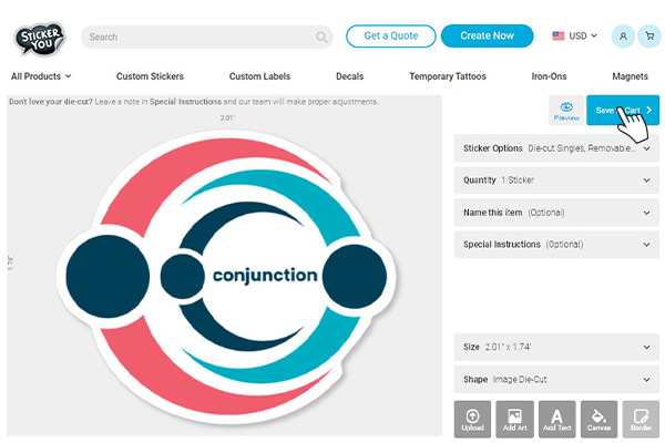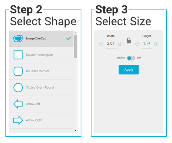 Step 3: After a successful upload you’ll be able to select the die-cut shape, size, and quantity of your product. Available options may be different depending on the product you’re creating.