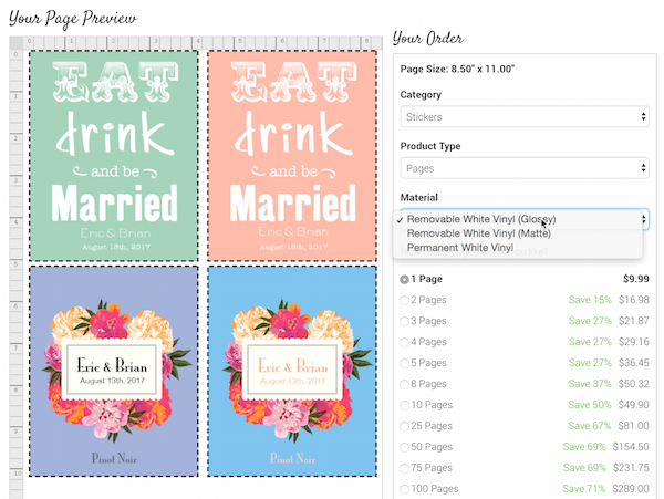 Our team has recently launched our upgraded PageMaker Tool! Not only is it easier to use and much faster, but we now offer the ability to create wine labels that have multiple designs per page! This brings customization to a whole new level, and allows you to personalize each individual label. Whether you’re creating individual named wines for your bridesmaids, or simply creating labels for your homegrown business, our PageMaker is a breeze to access and order online!